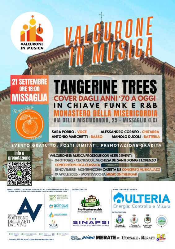 Concerto GRATUITO di TANGERINE TREES del 21 Settembre ore 18:00 presso il Monastero della Misericordia a Missaglia, prenota qui: https://www.promontevecchia.it/index.php/valcurone-in-musica/prenota-valcurone-in-musica/