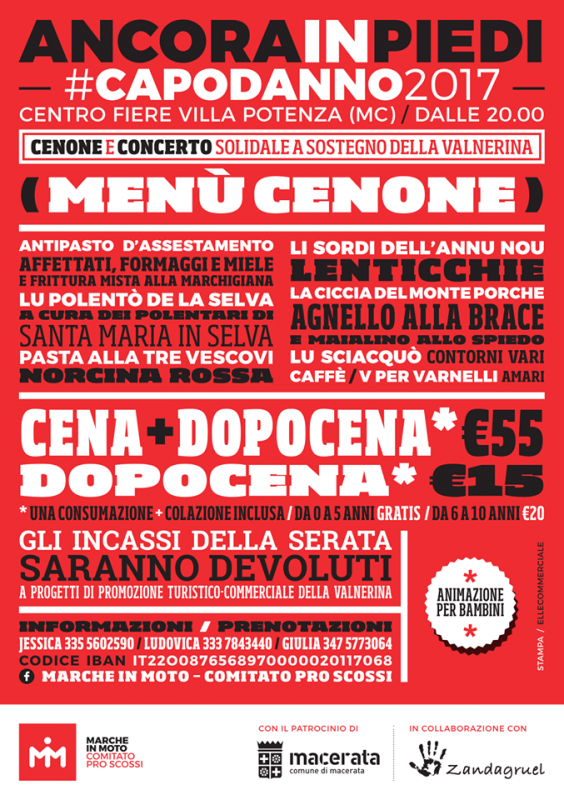 Ancora in Piedi #Capodanno2017 è un evento a cura di Marche in Moto - Comitato Pro Scossi che vedrà la partecipazione attiva di ristoratori, pasticceri, norcini e volontari, residenti nel cratere del recente sisma che ha colpito l'alto maceratese, i quali proporranno piatti tipici dei suddetti luoghi, facendone conoscere i sapori e promuovendo la vendita dei loro prodotti.