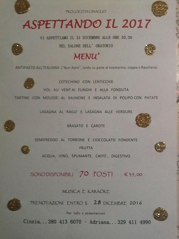 La Pro Loco di Cinaglio festeggia il Capodanno con il Gran Cenone di Fine Anno nel salone dell'oratorio.