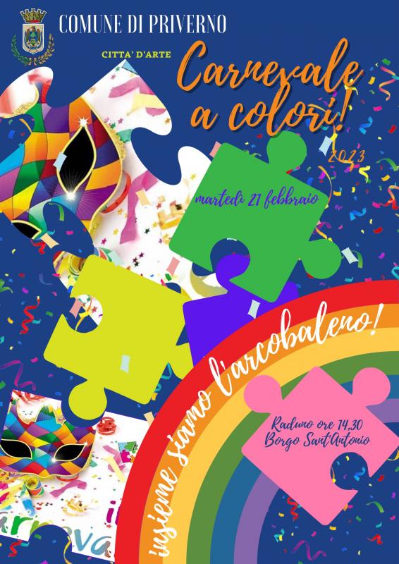 Si è pensato ad un “Carnevale a colori”, per questa edizione 2023, che abbia come elementi primari i colori dell’arcobaleno, da far sfilare in una parata di rosso, arancione, giallo, verde, azzurro, indaco e violetto, a ricordare le tante immagini di speranza affacciate in finestra, che oggi, vogliamo liberare rendendo omaggio ai colori della creatività, dell’allegria e della pura espressività.