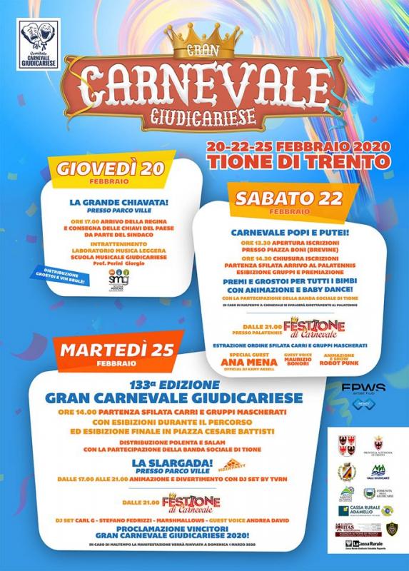 A Tione di Trento in provincia di Trento si svolge nei giorni 20, 22 e 25 Febbraio 2020 la Festa di Carnevale.