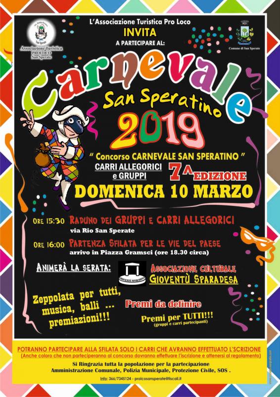 L'Associazione Turistica Pro loco di San Sperate, in collaborazione con l'Ass.ne Cult. Gioventù Sparadesa e il Comune di San Sperate - Domenica 10 Marzo - vi invita a partecipare al Carnevale San Speratino 2019.