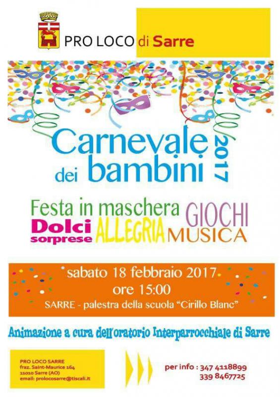 Sabato 18 febbraio 2017 Carnevale in maschera dei bambini a Sarre presso la Palestra della scuola "Cirillo Blanc".