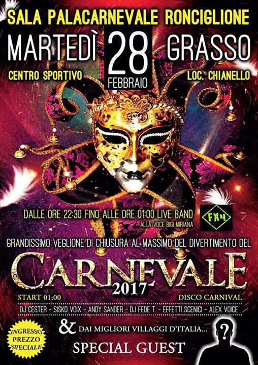 Martedì grasso 28 febbraio 2017 alla sala Palacarnevale Ronciglione Centro Spostivo in loc.chianello