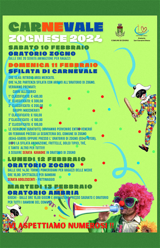 Il Comune e l’Oratorio di Zogno organizzano una serie di iniziative per il CARNEVALE ZOGNESE 2024.