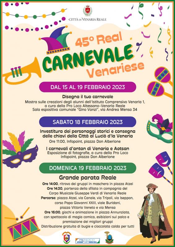 La Città di Venaria Reale organizza, in collaborazione con il Comitato Carnevale e l'Associazione turistica Pro Loco Altessano-Venaria Reale, la 45ª edizione del Real Carnevale Venariese.