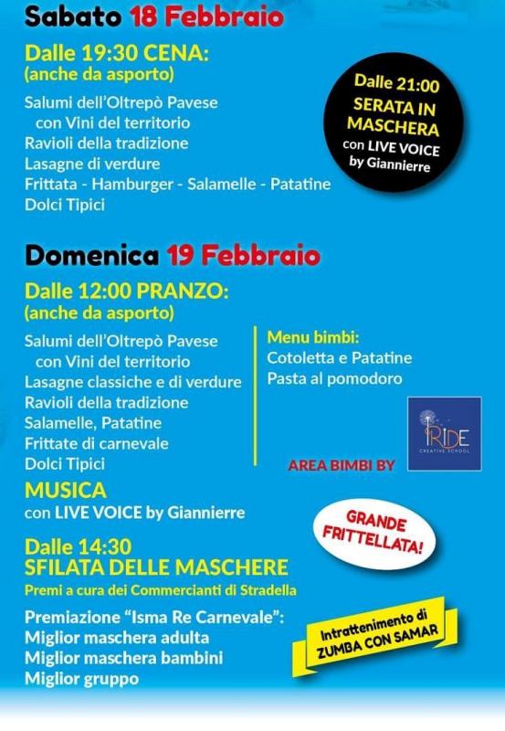 Sabato 18 cenone in piazza dalle 19,30 con un ricco menù, festa in maschera e serata di intrattenimento con Giannierre Live Voice.