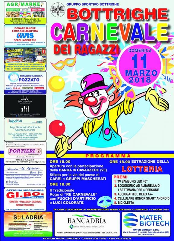 Domencia 11 marzo 2018, alle ore 15, torna il Carnevale dei Ragazzi di Bottrighe è organizzato dal GRUPPO SPORTIVO BOTTRIGHE in cui ci si diverte con: carri allegorici e gruppi mascherati, musica e spettacolo, banda musicale, intrattenimento con gli artisti di Clown Kirkos, trenino Dotto, Luna Park, bancarelle, estrazione lotteria, Rogo a Re Carnevale e spettacolo pirotecnico.