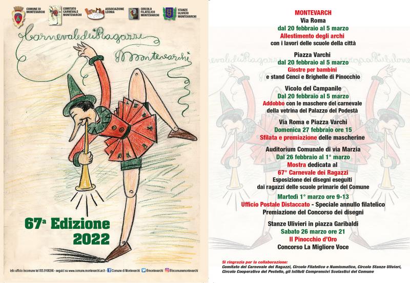 Dal 20 febbraio al 1° marzo in piazza Varchi e lungo via Roma, si svolgerà la 67^ edizione del Carnevale dei Ragazzi, grazie alla collaborazione tra l’Amministrazione Comunale, il Comitato del Carnevale di Montevarchi, l’Associazione Montevarchi Arte, la Società Cooperativa del Pestello, il Circolo Filatelico di Montevarchi, il Circolo Stanze Ulivieri, l’Associazione Varchi Comics e gli Istituti Comprensivi del territorio.