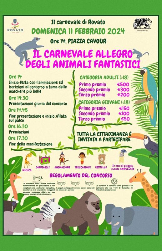 A Rovato in provincia di Brescia si svolge nella giornata di Domenica 11 Febbraio 2024 dalle ore 14.00 in Piazza Cavour, la Festa di Carnevale "Il Carnevale Allegro degli Animali Fantastici".