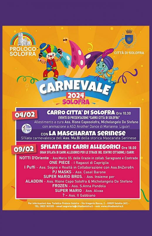 Ecco il programma eventi dell'edizione 2024 del Carnevale Solofrano organizzato dalla Proloco Solofra con il patrocinio del Comune di Solofra: