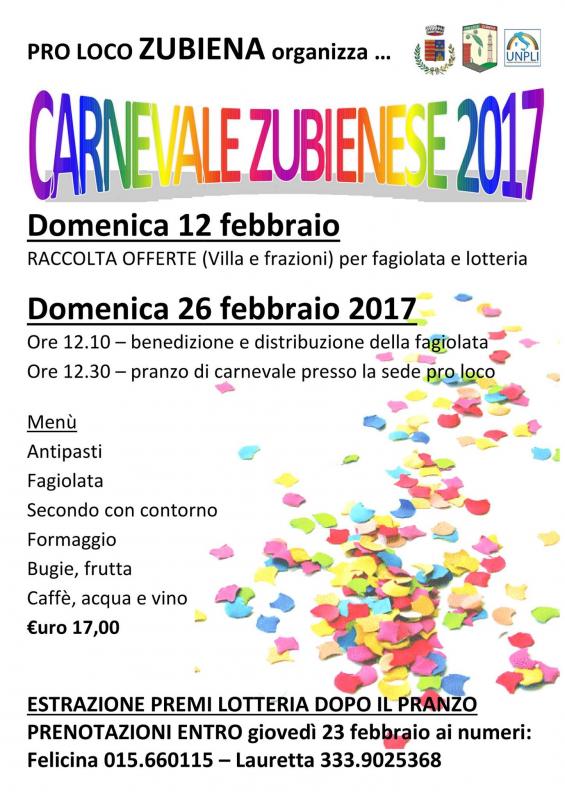 Domenica 26 febbraio 2017 si fa festa con il Carnevale di Zubiena e la Fagiolata con la Pro Loco.