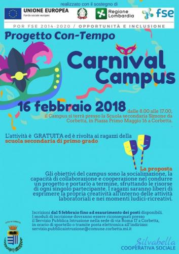 Inoltre il 16 febbraio il Progetto Con-tempo presenta Carnival Campus, dedicato ai ragazzi e alle ragazze della scuola secondaria di primo grado del Comune di Corbetta. L'iscrizione è gratuita ma i posti sono limitati. Il campus si svolgerà presso la struttura stessa della scuola secondaria di primo grado “Simone da Corbetta”,