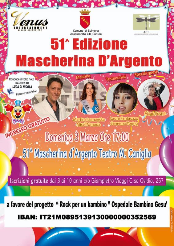 Gli eventi della cinquantesima edizione del Carnevale a Sulmona iniziano domenica 3 marzo 2019, alle ore 17, al teatro Maria Caniglia di Sulmona con il concorso "Mascherina D'Argento", presentato dal volto noto di Rai Uno Luca Di Nicola.