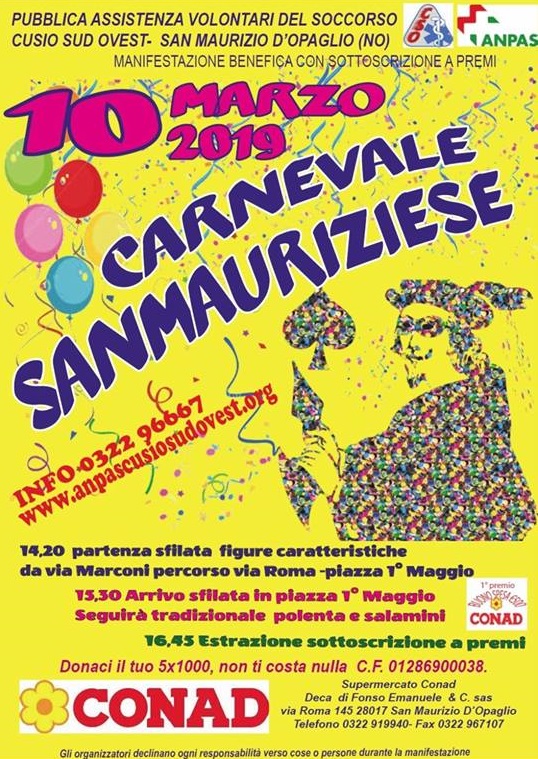 I Volontari Soccorso San Maurizio ANPAS CSO invitano domenica 10 marzo 2019 a San Maurizio D'Opaglio (NO) per fare festa al Carnevale Sanmauriziese 2019.