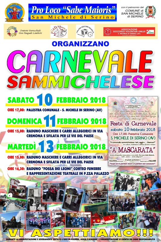 Carnevale Sammichelese 2018. Gli eventi del Carnevale di San Michele di Serino si svolgono quest'anno sabato 10, domenica 11 e martedì 13 febbraio 2018.