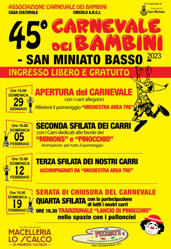 L'appuntamento con il Carnevale dei Bambini di San Miniato Basso inizia con il mese di gennaio , Domenica 29 gennaio , e continuerà ogni Domenica fino a Domenica 19 Febbraio, giornata conclusiva in cui verrà lanciato Pinocchio nello spazio. Il burattino,realizzato in carta pesta infatti, salirà al cielo nel pomeriggio, circondato da decine di palloncini,per prendere il volo sotto gli occhi dei bambini. Il Carnevale dei Bambini si svolge all'aperto nello spazio area circostante la Casa Culturale e Circolo Arci, (piazza Pizzigoni 5) oppure in caso di maltempo negli spazi interni della casa Culturale. L'evento segna una costante di lunga tradizione e cura di questo evento da parte del Comitato organizzatore, che si dedica da quarantadue edizioni, con immutata passione, all'intrattenimento dei più piccoli creando opportunità e giornate di svago per tutta la famiglia.