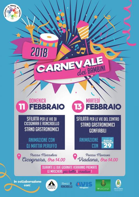 Da una splendida collaborazione tra Proloco Viadana, Associazione La Bugada Ad Sigugnera, Amici Di Roncadello, Avis Cicognara ed il Comune di Viadana, domenica 11 e martedì 13 febbraio 2018 si svolge il Carnevale Dei Bambini.