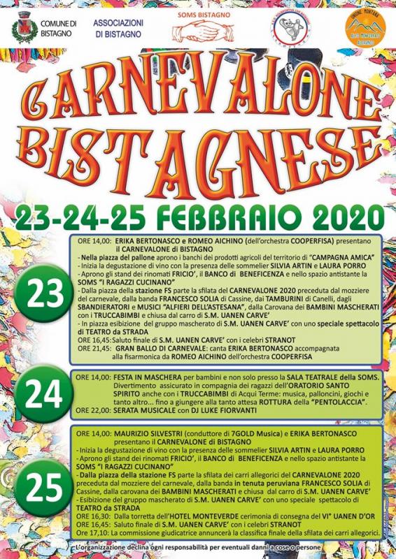 Lo storico Carnevale di Bistagnese, come da tradizione organizzato dalla S.O.M.S. in collaborazione con le associazioni bistagnesi, quest'anno prevede tre giorni di grande divertimento con pesca, feste in mashera, mercatino, animazioni e tanto altro.