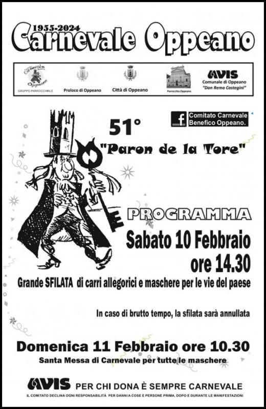 Sabato 10 Febbraio 2024, ore 14:30, il tradizionale Carnevale Veronese approda a Oppeano con una grande sfilata di carri allegorici e maschere: per le vie del paese musica, balli, tra colorate stelle filanti e coriandoli, per vivere tutta l'allegria e la vivacità del Carnevale e il 51° "Paron de la Tore".