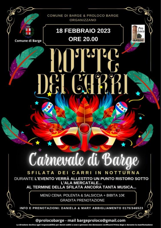 Sabato 18/02 per concludere in bellezza il carnevale bargese... Alle ore 21.00 Sfilata in Notturna dei carri allegorici per le vie del Paese, a seguire si continua a ballare con la Festa di carnevale con i dj dei carri sotto l'ala!!
