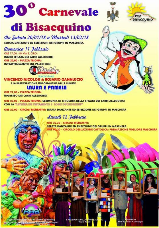 La 30^ edizione del Carnevale Bisacquinese prevede serate danzanti a Bisacquino tutti i sabati dal 20 gennaio al 13 febbraio (martedì grasso).
