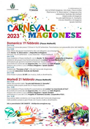 Organizzato fin dal 1961 dalla Proloco di Magione vede come da consuetudine, accanto alla sfilata di carri e maschere, il classico "Processo a Toni", re del Carnevale Magionese, che si terrà domenica a cura del Laboratorio Teatrale del Martedì. Simbolo delle malefatte accadute nel paese, la maschera verrà bruciata il martedì grasso portando con sé i guai e le malefatte nella speranza di tempi migliori. Le due giornate saranno accompagnate da tanta musica, con la Filarmonica G. Biancalana e le Majorettes di Magione, tradizione e gusto con Segavecchia, CISA e Unitre, divertimento e animazione delle tante associazioni coinvolte insieme alla Proloco: Arci e Soms, Avis e Atletica Magione, Spazio Genitori, Circolo Didattico di Magione, Scuola dell'Infanzia G. Danzetta e Cooperativa Polis (CAG Progetto ITI Trasimeno Sociale).