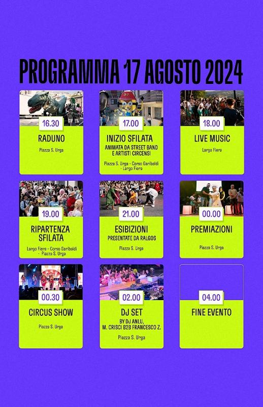 - Ore 17.00 Inizio della sfilata (animata da street band e artisti circensi) da piazza Salvatore Urga, poi corso Garibaldi e Largo Fiera