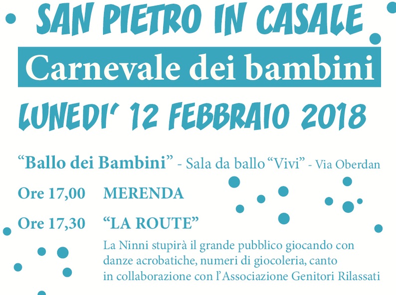 Oltre alle due domeniche di sfilate (11 e 13 febbraio 2018) il programma del Carnevale di San Pietro in Casale prevede anche il Carnevale dei Bambini lunedì 12 febbraio 2018 presso la sala da ballo Vivi di via Oberdan.