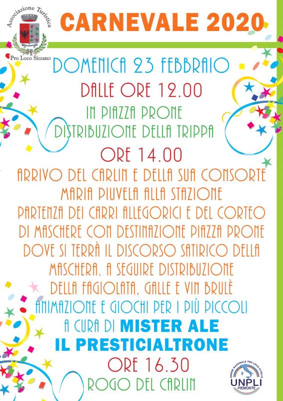 Domenica 23 febbraio 2020 a Sizzano si farà festa con il CarluÈ 2020, i tradizionali festeggiamenti di Carnevale che portano nella cittadina piemontese tanta allegria, eventi per i più piccoli, degustazioni, maschere tradizionali, coriandoli, stelle filanti e tanti sorrisi.