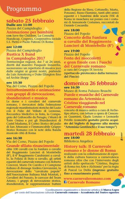 sabato 25 febbraio come da tradizione, il cuore del palinsesto del Carnevale Romano è la Gran Sfilata equestre, che partirà alle 16,00 da Piazza del Popolo per svilupparsi negli stessi luoghi dei grandi eventi carnascialeschi della Roma papalina rinascimentale, il cui evento principale era la corsa dei cavalli berberi su via del Corso, che ispirò per secoli le arti di grandi scrittori, pittori e artisti oltre ad attrarre a Roma la nobiltà di tutta Europa.