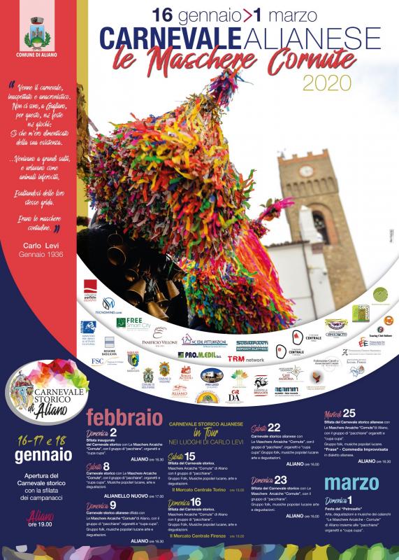 Il Comune, la Pro Loco, il Circolo Panevino e il Parco Letterario "Carlo Levi" di Aliano Vi invitano dal 16 Gennaio al 01 Marzo 2020 al Carnevale Alianese 2020.