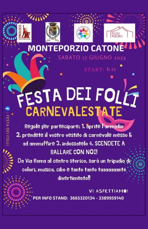 A Monte Porzio Catone in provincia di Roma si svolge nella giornata di Sabato 17 Giugno 2023 la Festa di Carnevale "Carnevalestate - Festa dei Folli".