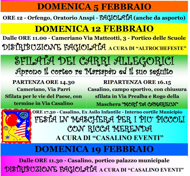 Si festeggia il 5, 12, 19 febbraio 2023 il Carnevale Casalinese, evento organizzato con il patrocinio del Comune di Casalino la collaborazione delle Associazioni ricreative “Altrochefeste”di Cameriano, “Casalino Eventi” di Casalino e dell’Oratorio Anspi di Orfengo, il Comitato Carnevale.