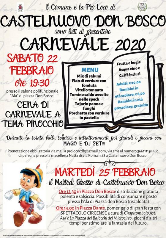 Il Comune e La Pro Loco di Castelnuovo Don Bosco (AT) sono lieti di presentare “Carnevale a Castelnuovo Don Bosco”, che avrà luogo Sabato 22 e Martedì 25 Febbraio 2020.