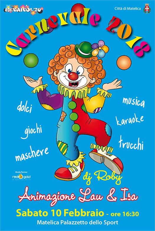 Al Palazzetto dello Sport di Matelica grandissimo pomeriggio di Carnevale per i più piccoli, con dolci, giochi, maschere, musica, karaoke e trucchi, in compagnia di DJ Roby e con l'animazione di Lau & Isa