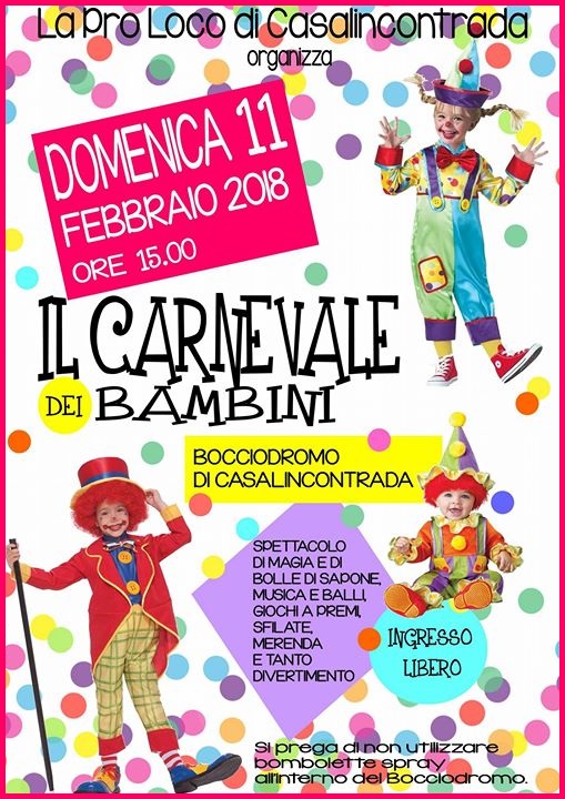 Vi aspettiamo dalle ore 15:00 presso il Bocciodromo di Casalincontrada. Animazione, spettacoli di magia e di bolle di sapone, giochi a premi, baby dance, sfilata di mascherine e tante cose buone da mangiare... Divertimento assicurato!!!