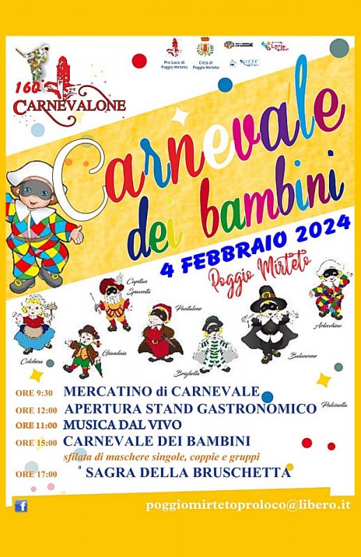 Il Carnevale Dei Bambini a Poggio Mirteto si svolge Domenica 04 Febbraio 2024 con la tradizionale sfilata di maschere e gruppi mascherati. Inoltre si tiene nella stessa giornata la 50a Sagra della Bruschetta.