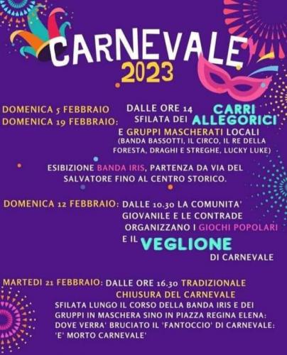 21 febbraio 16:30 sfilata per le vie del centro e viene bruciato il fantoccio di Carnevale