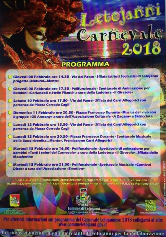Si inizia Giovedì grasso, 8 febbraio, con la sfilata dei bambini delle scuole di Letojanni intitolata "Natural…Mente", in difesa dell'ambiente, con le loro riciclatissime e coloratissime maschere. La partenza è prevista da Piazza Cagli alle ore 14.30. Nello stesso pomeriggio, a partire dalle ore 17.30 presso il palazzo polifunzionale, si svolgerà uno spettacolo di animazione ed intrattenimento dedicato ai più piccoli dal titolo “Coriandoli e Stelle Filanti”.