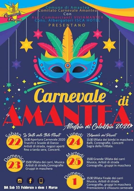 Ritorna il “Carnevale di Amantea – Allegria di Calabria” con un programma ancora più intenso del passato. Infatti, alle tre sfilate dei carri e al “Carnevale dei Piccoli” si aggiunge quest’anno l’anteprima di sabato 22 febbraio con la “Notte delle Stelle Filanti”, organizzata dall’Associazione Commercianti “ViviAmantea”. Lungo le vie del centro, con i negozi aperti fino a tardi, si alterneranno gruppi musicali, le scuole di ballo, gli artisti di strada, le sfilate di gruppi mascherati, l’esibizione delle “drag queen”, per finire con la musica da discoteca in piazza.