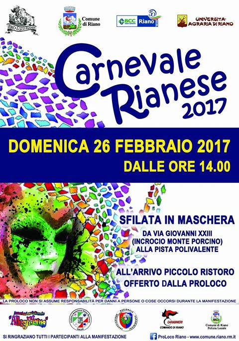 Anche quest'anno la PROLOCO di Riano è fiera ed orgogliosa di presentare il "carnevale Rianese". dopo il successo delle ultime edizioni organizzate e dirette dalla Proloco, che hanno visto sfilare carri e gruppi mascherati per le vie di Riano anche per quest'anno si è deciso di portare un pò di allegria nel nostro paese.come ogni evento vi attendiamo numerosi e più precisamente in piazza degli eroi alle ore 14.00 per sfilare insieme a noi, ed insieme a tutti gli altri gruppi che hanno deciso di partecipare e condividere questo bel evento con gruppi mascherati e carri allegorici.