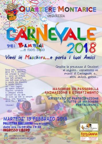 Martedì 13 febbraio 2018 alla Palestra Ballarini (Via Bronzini), dalle ore 16:00 alle 19:30, si fa festa con il Carnevale dei Bambini 2018, organizzazione a cura del Quartiere Montarice con il Patrocinio del Comune di Porto Recanati