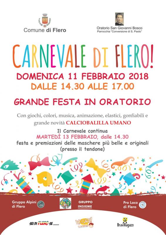 Domenica 11 febbraio 2018, dalle ore 14,30 alle 17, si inizia a festeggiare il Carnevale Flerese 2018 con la grande festa all'oratorio di Flero, con balli, calcio balilla umano, animazione, musica e tanto altro.