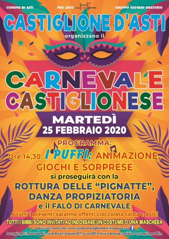 Martedì 25 febbraio 2020, martedì grasso, a Castiglione d'Asti arriva il Carnevale Castiglionese 2020 con animazione, sfilata di maschere, falò carnevalesco, danze e tanto altro.