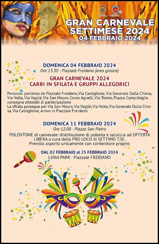Presso il Piazzale Freidano a Settimo Torinese in provincia di Torino si festeggia nella giornata di Domenica 04 Febbraio 2024, dalle ore 13.30, il Carnevale con la sfilata dei Carri e dei Gruppi Allegorici.