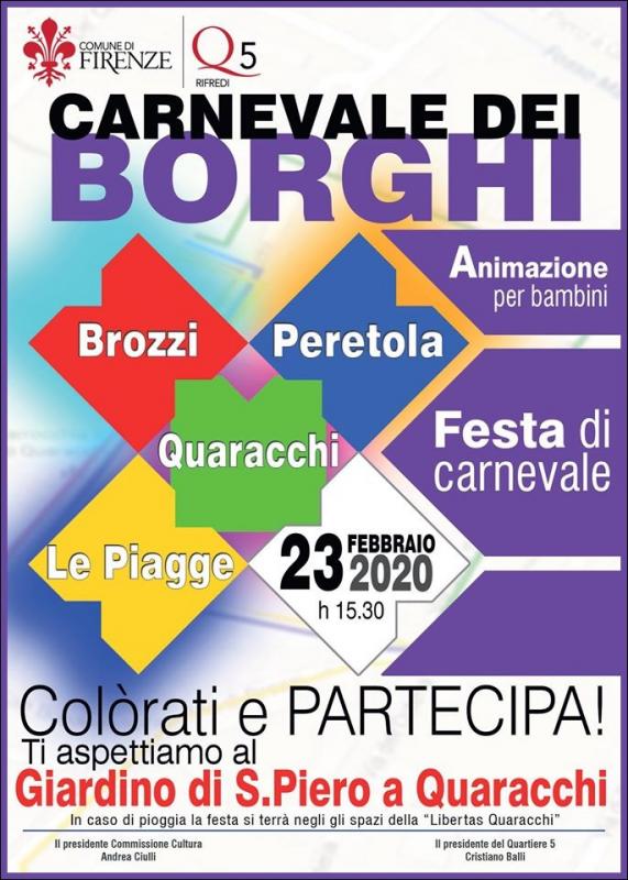 Domenica 23 Febbraio dalle ore 15.30 torna il tradizionale Carnevale dei Borghi -Brozzi, Peretola, Quaracchi, Le Piagge, nei giardini di San Piero a Quaracchi, con animazione per bambini. In caso di pioggia, la festa si svolgerà negli spazi della "Libertas Quaracchi" in via di Brozzi 99.