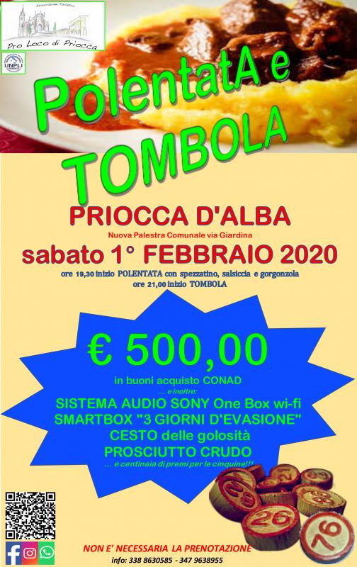 SABATO 1 febbraio 2020 nella nuova e modernissima Palestra Comunale di Via Giardina in Priocca la PRO LOCO DI PRIOCCA organizza la POLENTATA e la grandissima TOMBOLA 2020.