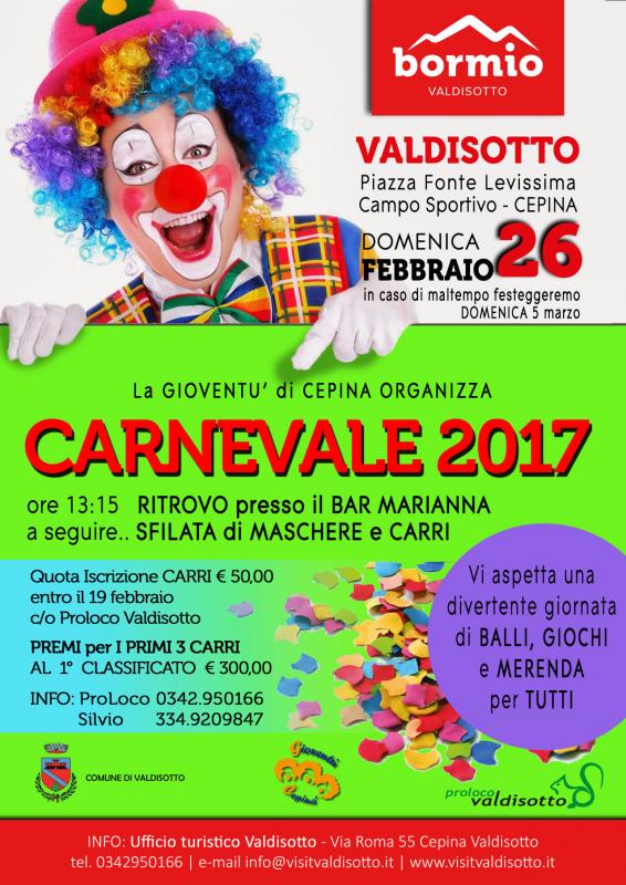 La Gioventù di Cepina organizza in data 26 febbraio 2017 il tradizionale Carnevale di Cepina, frazione di Valdisotto.