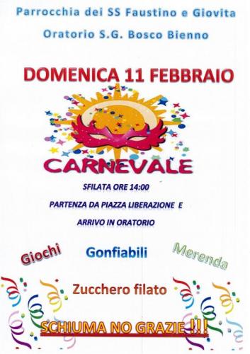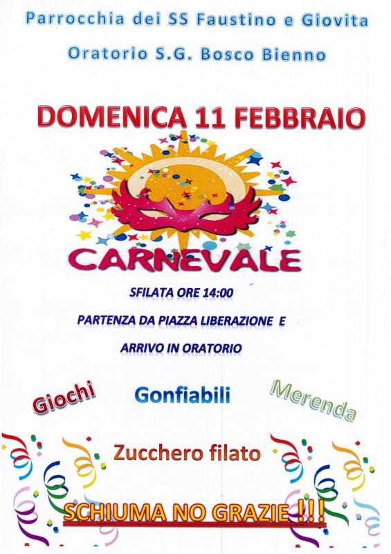 A Bienno, Valle Camonica, domenica 11 febbraio 2018 si festeggia il Carnevale alle ore 14.00 in Piazza Liberazione per la partenza della sfilata con arrivo in Oratorio